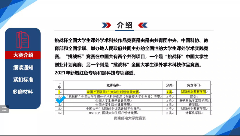 至此,电子与光学工程学院、柔性电子(未来技术)学院第118、119期菁英人才学校第八次授课圆满结束。通过本次课程,同学们对“挑战杯”与“互联网+”竞赛的流程与规则、竞赛过程中如何取得高分等细节有了一定的了解。希望能有更多同学积极参与创新创业大赛,培养自我创新能力,以建设科技强国为己任,踔厉奋发、笃行不怠,为科技创新事业贡献青春力量、书写无悔青春。