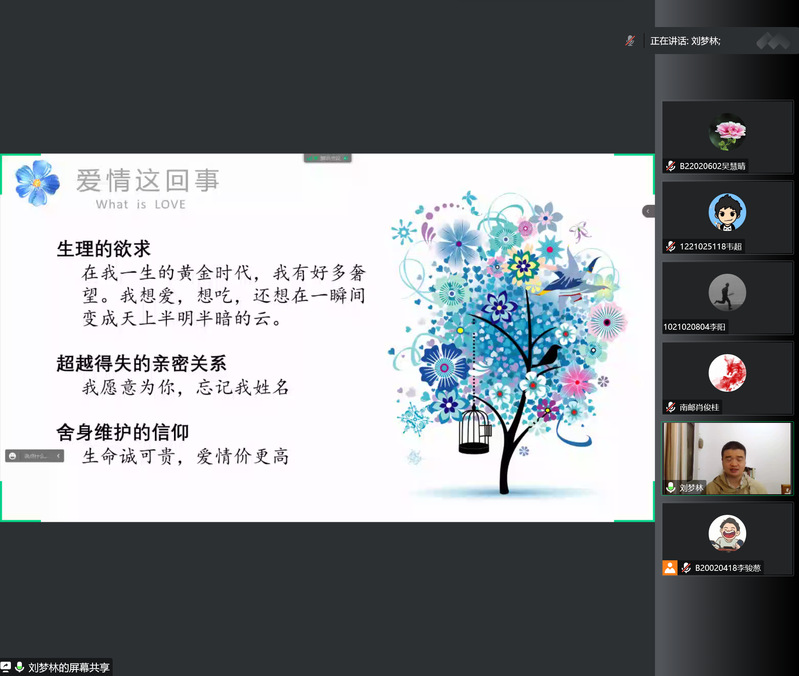 本次授课由南京邮电大学专职心理咨询师刘梦林老师担任主讲,菁英人才学校全体成员于线上参与本次课程。本次授课主题为《修炼爱情“指北”》。