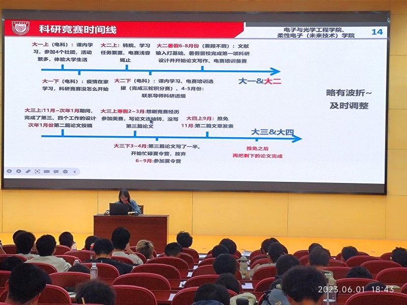 为激励学院学子更好地规划大学生活,了解考研、保研要求,做好更充分的准备迎接未来三年大学生活,6月1日,电子与光学工程学院、柔性电子(未来技术)学院开展南京邮电大学第五届优秀学子宣讲团走进电子与光学工程学院、柔性电子(未来技术)学院——“传承电科一流基因”活动。本次分享会邀请了2019级电光柔学院电子科学与技术专业优秀学子郭子涵同学为大家分享经验,2022级全体电子科学与技术专业学生参与,会议由2022级电子科学与技术辅导员强增寿老师主持。