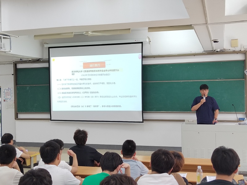 本次大会包含诚信教育、防范电信诈骗教育、本专业就业情况分析、考研情况分析等方面内容。大会伊始,赵昱莼老师向同学们讲解了南京邮电大学《普通高等教育本科毕业生学士学位授予办法》,再次向同学们说明了诚信考试的必要性,他强调,诚信为做人做事必须坚守的道德底线,作为一名大学生,应当真诚做人、守信做事,让诚信成为自身的的不懈追求和自觉行动。随后,赵老师列举了几种常见的电信诈骗类型,提醒同学们擦亮双眼、提高防范意识,注意保管好自己的个人财产。赵老师还向同学们列举了本届毕业生的考研数据和就业情况,剖析了当前的考研和就业形势,鼓舞同学们早日明确目标,朝梦想奋进。