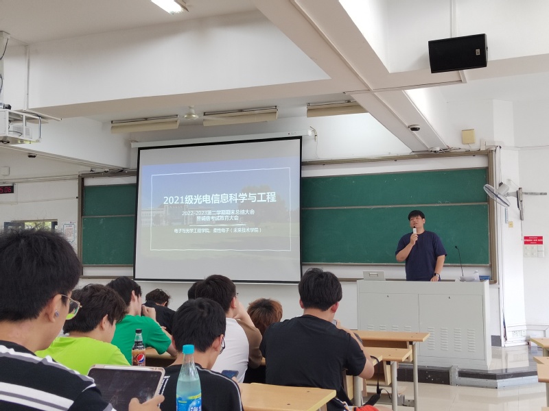 6月7日下午,电子与光学工程学院、柔性电子(未来技术)学院在教4-102召开2021级光电信息科学与工程专业2022-2023第二学期期末总结大会暨诚信考试教育大会。辅导员赵昱莼老师主持本次会议,2021级光电信息科学与工程专业全体学生参会。