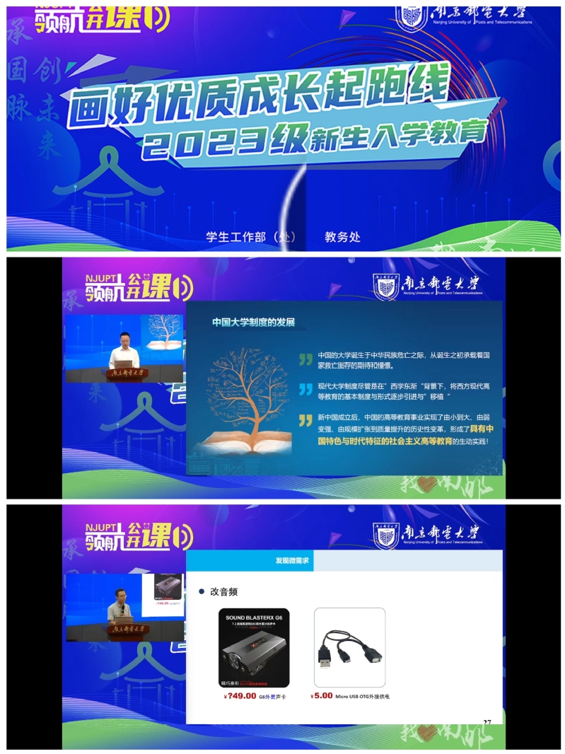 根据教育部思想政治工作司2023年工作要点,坚持以习近平新时代中国特色社会主义思想为指导,紧紧围绕深入学习贯彻党的二十大精神这条主线,以全面实施“时代新人铸魂工程”为牵引,结合学发〔2023〕4号《2023级新生入学教育工作指导意见》要求,以上好“开学第一课”为重点,2023年8月19日-20日,南京邮电大学组织开展“领航公开课”,电子与光学工程学院、柔性电子(未来技术)学院2023级新生全体成员准时收看线上直播。