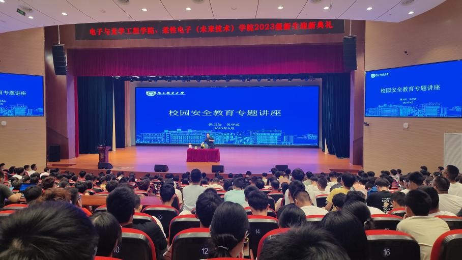 为全面普及校园安全常识,构建平安校园,帮助新生在校园中平安学习生活,9月10日,电子与光学工程学院、柔性电子(未来技术)学院2023级开展新生入学教育之安全教育专题讲座。本次讲座由保卫处副处长吴学政主讲,全体2023级学生参加。