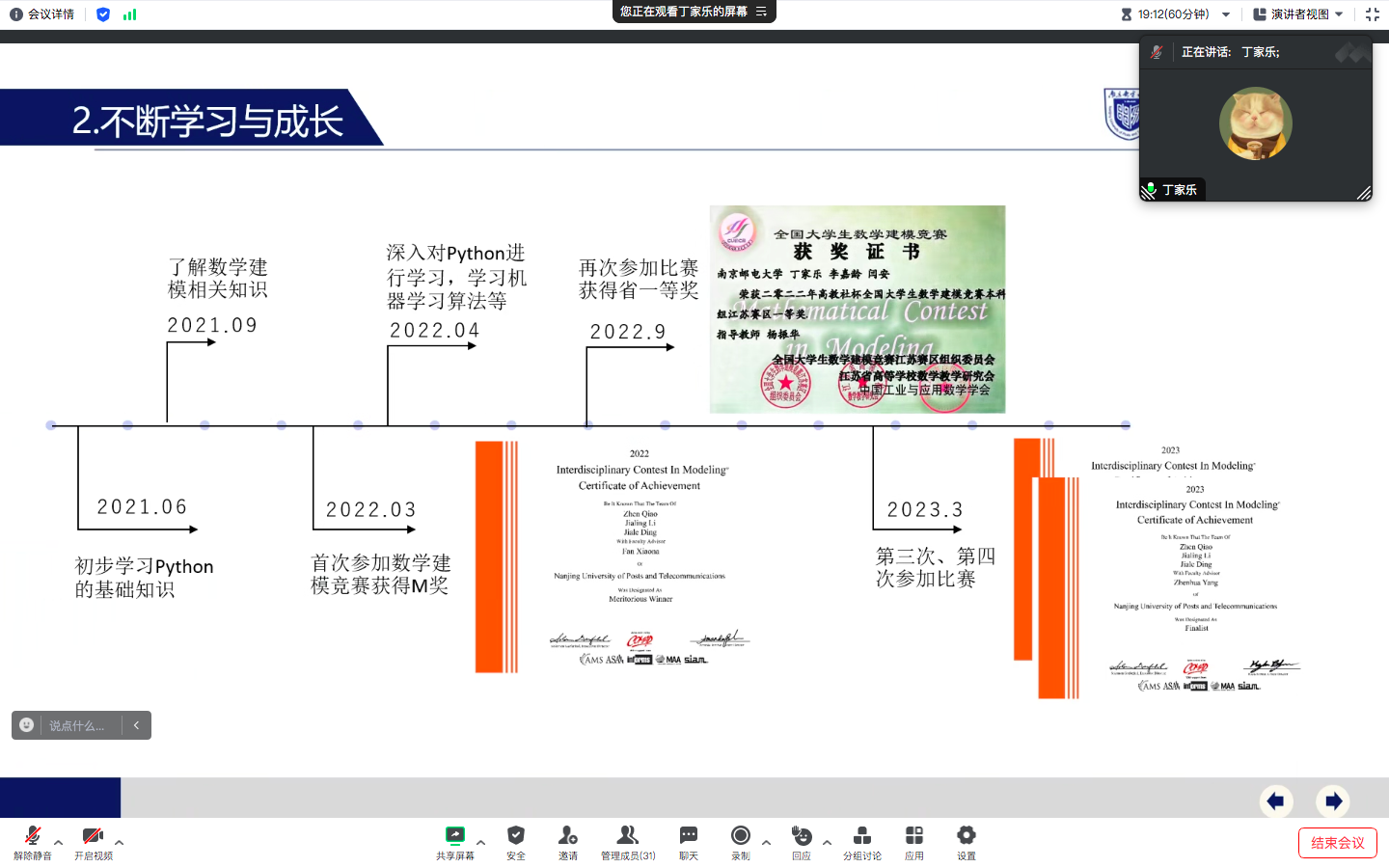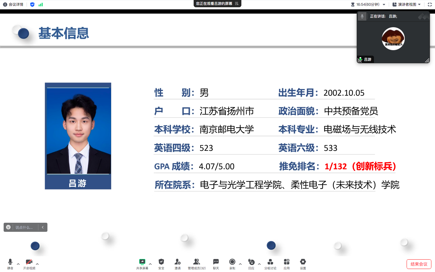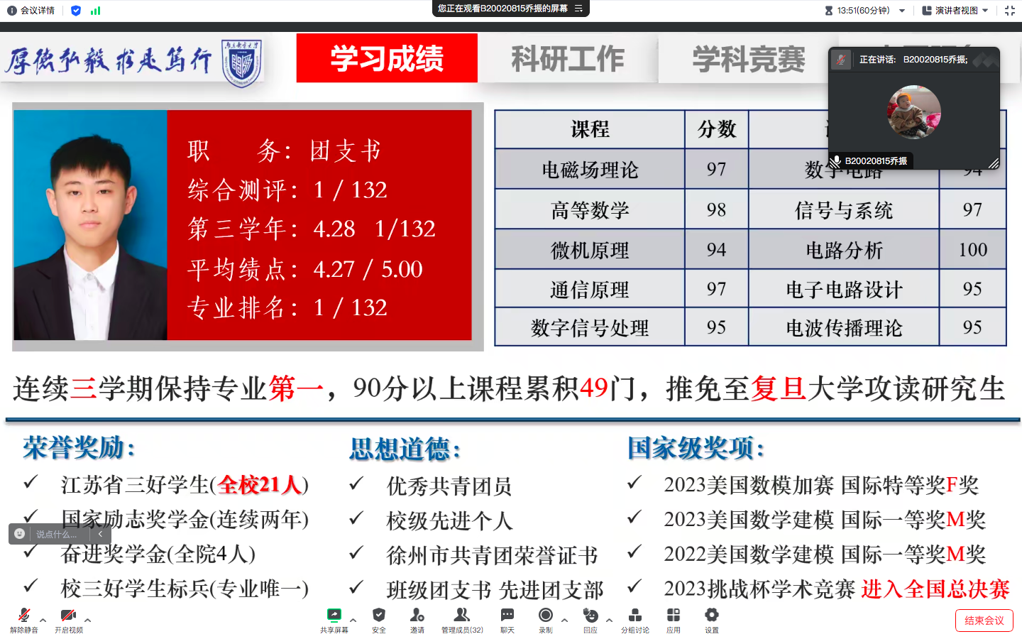 为树立典型,表彰先进,引导学生成为品德高尚、富有理想、快乐健康、积极向上、全面发展的新时代大学生,10月5日上午,电子与光学工程学院、柔性电子(未来技术)学院2020级电磁场与无线技术专业于线上开展了2022-2023学年“三好学生标兵” “三好学生”“优秀学生干部”公开答辩展示会,会议由辅导员肖俊桂老师主持。