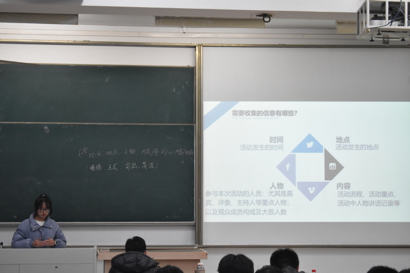 随后,学生会办公室部长刘碧荧同学从新闻稿的基本定义与特点入手,深入阐述了如何收集和整理新闻素材。她详细介绍了各种获取新闻素材的方法和技巧,并对比了非正式会议与大型正式会议新闻稿的撰写差异。最后,她强调了修改新闻稿的关键性,包括检查语法错误、调整句子结构、润色文字等。