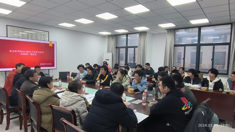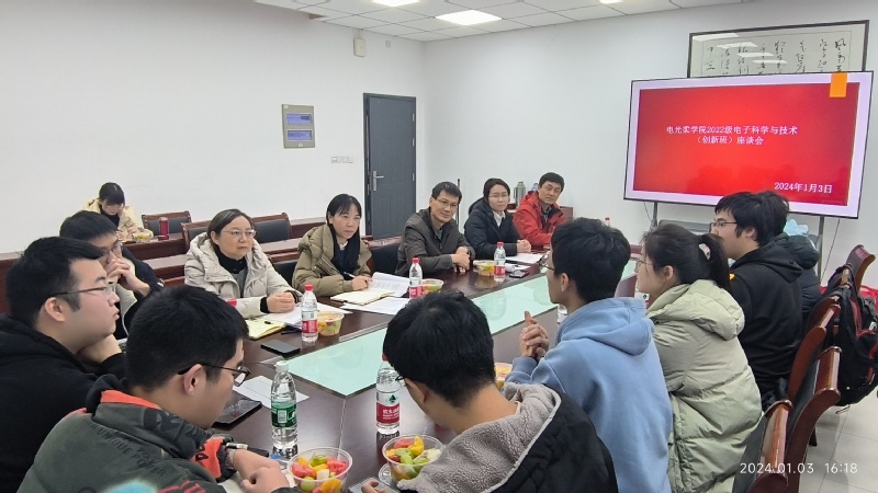 1月3日,南京邮电大学电子与光学工程学院、柔性电子(未来技术)学院2022级电子科学与技术(创新班)B220200班“师生同心、共话成长”座谈会于电光A楼328召开。本次座谈会为校、院领导与联系班级面对面座谈会,出席本次座谈会的校院级领导有赵强副校长,电光柔学院党委书记黄丽亚,工程训练中心主任、电光柔学院副院长程勇,电光柔学院党委副书记、副院长徐磊,电光柔学院副院长刘蕾蕾,电光柔学院副院长刘宁,此外,B220200班班主任李炳祥、辅导员强增寿、B220200班全体同学参加了会议。