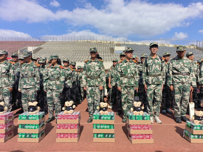 随后,2024级学生代表向全体教官赠送满载学院记忆的“电光柔奋斗小熊”和防暑饮品,表达了最诚挚的谢意。在场领导、老师给同学们分发慰问礼品,不仅仅为同学们送来炎炎烈日中的一丝清凉,也增添了同学们迎接更多挑战的信心。
