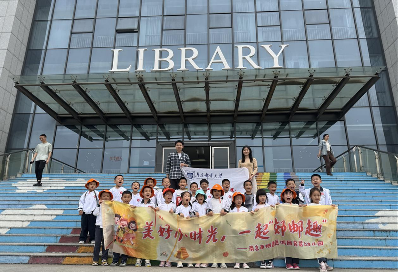 幼儿园到大学的跨越是一种新奇的体验。小朋友们参观过校史馆后,手拉手来到图书馆前大草坪上做游戏,开心地奔跑着、跳跃着。