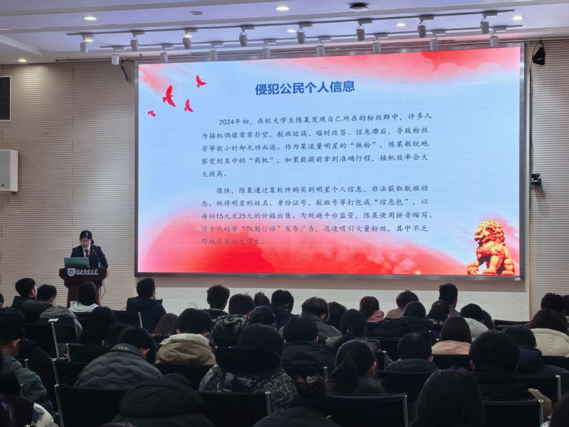 随后,王法官展开专题讲座,她从大学生违法犯罪现状及特点切入,用详实的数据呈现了当前高校犯罪数量上升、类型多样化、手段智能化等趋势,重点剖析了诈骗、帮助信息网络犯罪活动、掩饰隐瞒犯罪所得、侵犯公民个人信息等大学生常见犯罪类型。讲座中,王法官通过四川成都李某网络诈骗、龚某某“跑分”助贷等真实案例,深入解读了相关法律条文,揭示了犯罪行为背后个人、家庭、学校、社会等多方面成因,让同学们直观感受到法律的威严与违法的代价。讲座结束后,王法官还为大家播放了改编自真实案例的微电影《羁绊》,影片中大学毕业生因求职不慎卷入非法集资的故事,引发了同学们的强烈共鸣与深刻反思,进一步强化了大家的风险防范意识。