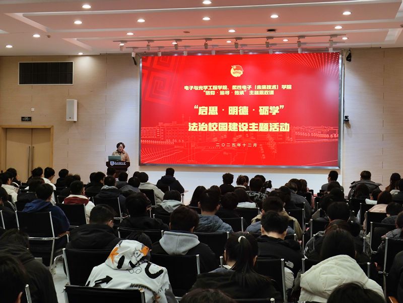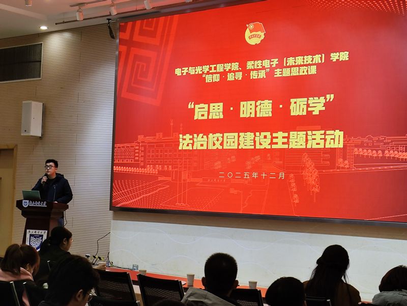 为深入推进法治校园文化建设,筑牢大学生成长成才的法治防线,12月17日下午,电子与光学工程学院、柔性电子(未来技术)学院2025级师生在中兴报告厅开展了一场沉浸式法治校园建设主题活动。学院特邀南京市鼓楼区人民法院刑庭法官王姣为2025级学子带来一场兼具专业性与实用性的法治专题讲座。学院党委副书记、副院长徐磊,分团委书记吴鹏,2025级辅导员姜子潮、刘心宇、孜乃提古丽·布尔汉、赵昱莼、强增寿及2025级学生代表出席活动,姜子潮主持本次活动。